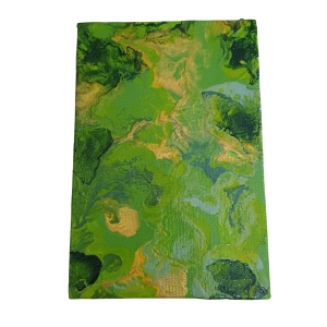 Fresh green, soft white flecks, muted forest tones, deep moss green, and elegant gold detailing. Inspired by early-morning dew on grass, delicate webs, and nature’s quiet enchantment.